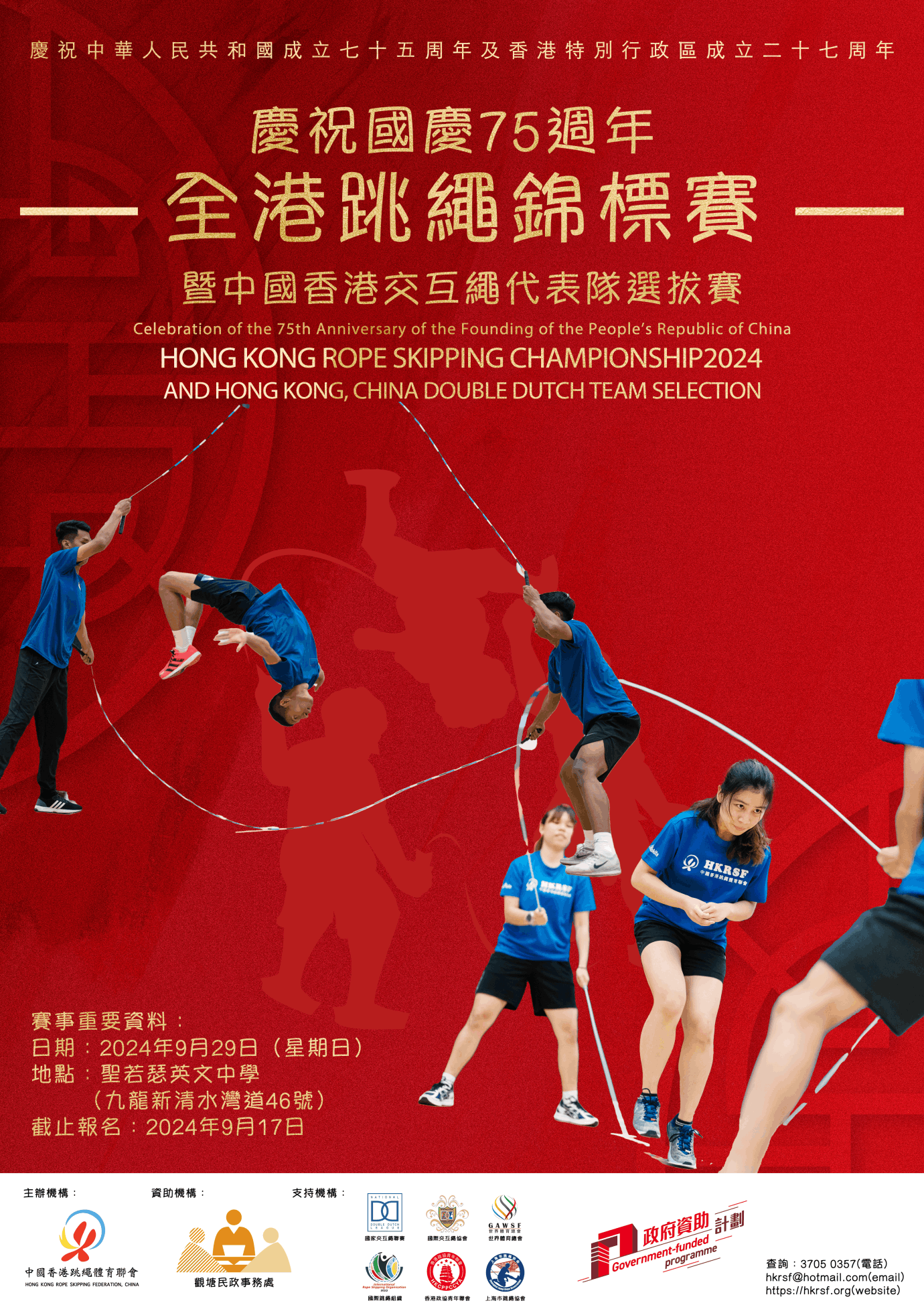 The Hong Kong Rope Skipping Federation, China will hold the “Hong Kong Double Dutch Championships 2024 & Hong Kong, China Rope Skipping Team Selection” at St. Joseph’s Anglo-Chinese School from September 29, 2024. The athletes’ performance in the competition will be one of the criteria for selection into the Hong Kong, China team. Athletes who are successfully selected for the Hong Kong, China team will have the opportunity to step onto the world stage and compete with a host of world-renowned athletes.
