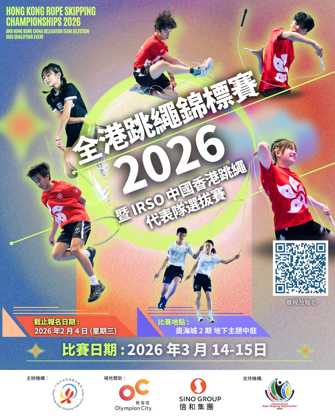 The Hong Kong Rope Skipping Federation, China will hold the “Hong Kong Rope Skipping Championships 2026 & Hong Kong, China Rope Skipping Team Selection Competition” at Olympian City from March 14 to 15, 2026. The athletes’ performance in the competition will be one of the criteria for selection into the Hong Kong, China team. Athletes who are successfully selected for the Hong Kong, China team will have the opportunity to step onto the world stage and compete with a host of world-renowned athletes.